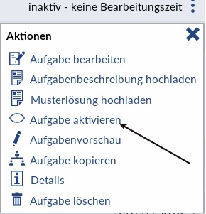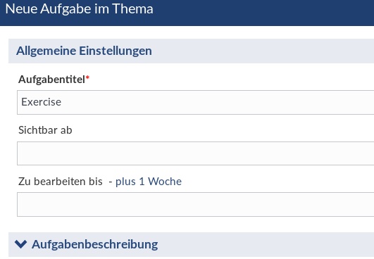 Jetzt können Sie Abfolge und Laufzeit der Aufgaben planen. Die Teilnehmenden bekommen ab dem Zeitpunkt „Sichtbar ab“ die Aufgaben und die Frist zur Bearbeitung angezeigt. Ein Klick auf den Link "plus 1 Woche" trägt, abhängig von dem Startdatum, automatisch das in einer Woche darauf folgende Datum ein. Achten Sie darauf, dass Sie möglicherweise das Thema noch aktivieren müssen. Wenn Sie bei der Erstellung einer Aufgabe keinen Bearbeitungszeitraum eingegeben haben, ist dies auch über das Aktionsmenü möglich.