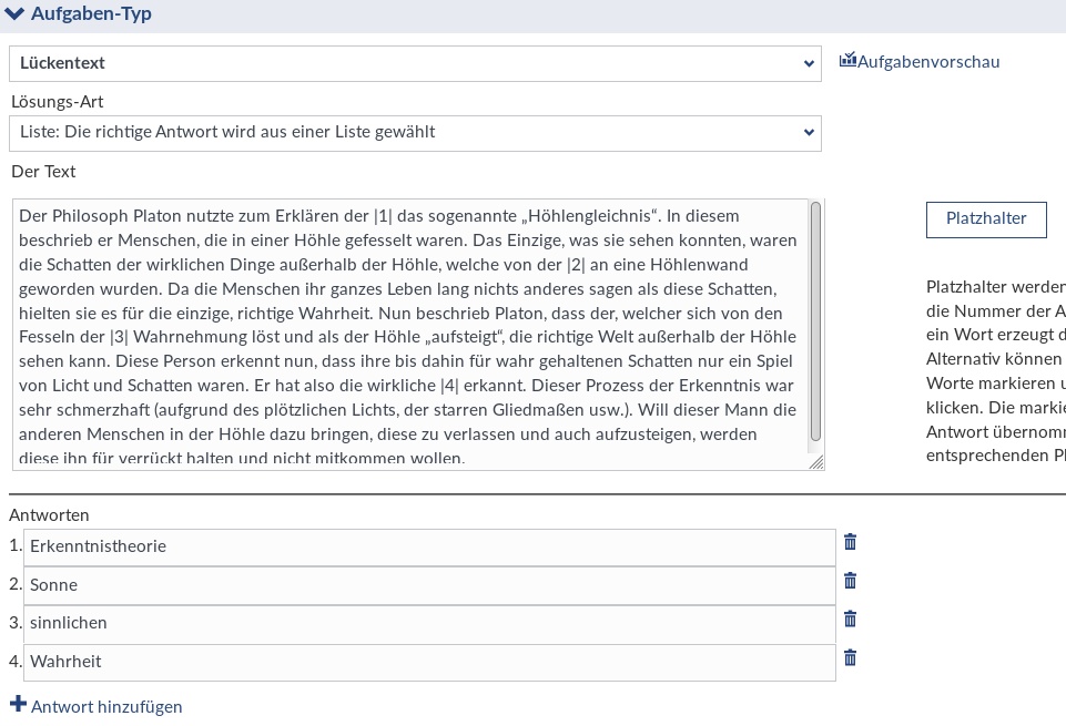 Wird der Aufgabentyp Lückentext gewählt, werden drei Lösungsarten angeboten: