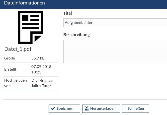 Eine einzelne Datei kann über den Button im Infofenster heruntergeladen werden, oder (bei entsprechender Berechtigung) über das Aktionsmenü. Mit dem Knopf in der Listenansicht werden alle Dateien der Liste in ein Archiv (.zip) gebündelt und zum Download angeboten.