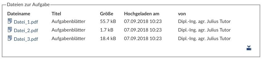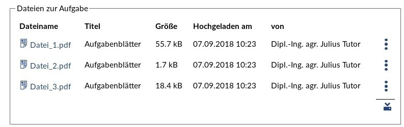 Die Liste der Dateien bietet Bearbeitungsfunktionen, die abhängig von den Berechtigungen in Stud.IP sind. Das obige Beispiel zeigt die Dateiliste für eine Aufgabe aus Sicht der Lehrenden. Die Teilnehmenden bekommen die Liste so dargestellt: