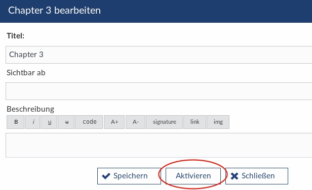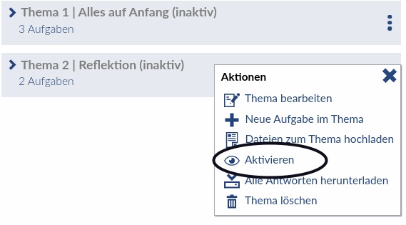 Bei der Erstellung eines Themas tragen Sie einen Titel, eine kurze Beschreibung und das Datum ein, ab wann das Thema für die Teilnehmenden freigeschaltet werden soll. Solange kein Sichtbarkeitsdatum eingetragen ist, können Sie die Aufgaben ganz in Ruhe organisieren und beliebig verändern, da die Teilnehmenden nichts davon angezeigt bekommen. Um ein Thema den Studierenden dann zur Bearbeitung freizugeben, gibt es zwei Wege. Schnell geht es über das Aktions-Menü, das Sie rechts finden. Hier wählen Sie den Punkt „aktivieren“. Dann wird das Tagesdatum als Startdatum eingetragen und das Thema ist für die Teilnehmenden sichtbar.