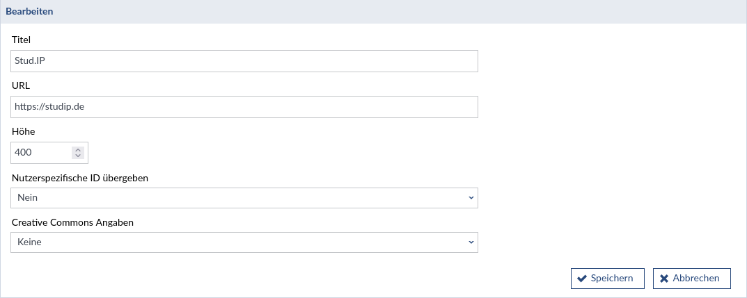 Dieser Block bindet externe Inhalte von anderen Websites ein. Es kann die URL der einzubindenden Website angegeben werden, sowie die Höhe die dieser Block einnehmen soll. Außerdem besteht die Möglichkeit eine einmalige User-ID an die eingebundene Seite zu übermitteln. Dies ID lässt keine Rückschlüsse auf den StudIP-Nutzer zu, identifiziert jedoch eindeutig. Zur Kennzeichnung der Inhalte können Creative Commons Angaben gemacht werden.