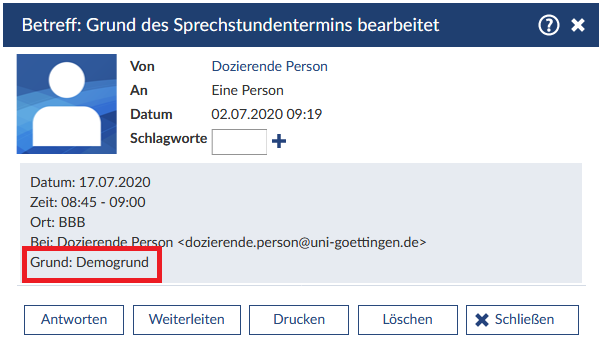 Die jeweilige Person erhält eine Nachricht über die Änderung, in der der geänderte Grund enthalten ist.
