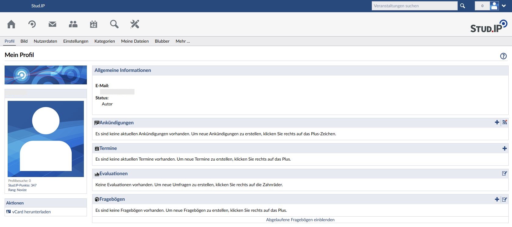 Hier haben Sie Gelegenheit, sich den anderen Nutzern des Systems zu präsentieren. Sie können ein Bild von sich hochladen, Ihren Lebenslauf oder Ihre Arbeitsschwerpunkte dokumentieren, persönliche oder öffentliche Termine, Umfragen oder News anlegen, Ihre Systemdaten verwalten und noch vieles mehr. Innerhalb bestimmter Grenzen können Sie Ihr Profil so gestalten, wie Sie es möchten und das alles ohne HTML-Kenntnisse!
