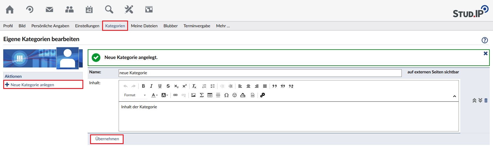Mit einem Klick auf die Schaltfläche Neue Kategorie anlegen erzeugen Sie eine neue Kategorie. Geben Sie in der ersten Zeile die Überschrift für die neue Kategorie an, im Kasten darunter die Inhalte. Sie können beliebig viele eigene Kategorien für Ihr Profil anlegen, z.B. Lieblingsfilme, gesammmelte Zitate, Mitteilungen für verschiedene Arbeitsgruppen etc. Ihrer Fantasie sind keine Grenzen gesetzt.