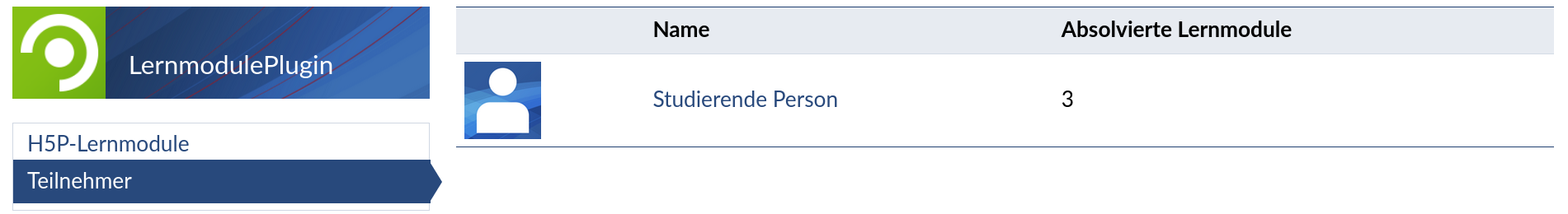 Standardmäßig ist die Ansicht "Lernmodule" gewählt. Dort sehen Sie eine Übersicht Ihrer Lernmodule. Sie können auch in die Ansicht "Teilnehmer" wechseln um eine Übersicht der Studierenden der Veranstaltung zu erhalten. Die Personen werden mit ihrem Namen aufgelistet und hinter dem Namen ist aufgeführt, wie viele Lernmodule bereits absolviert wurden.