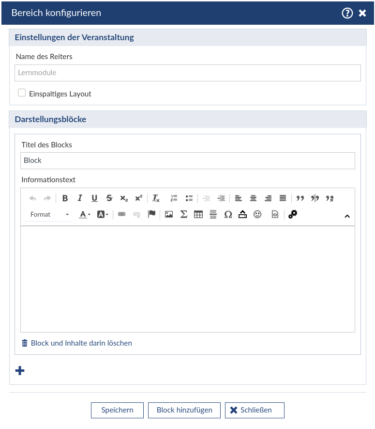 . Geben Sie unter "Titel des Blocks" einen Titel an, der über den untergeordneten Lernmodulen angezeigt werden soll. Zusätzlich können Sie weitere Informationen unter "Informationstext" hinzufügen. Möchten Sie einen Block und dessen Inhalt wieder entfernen, klicken Sie einfach auf
