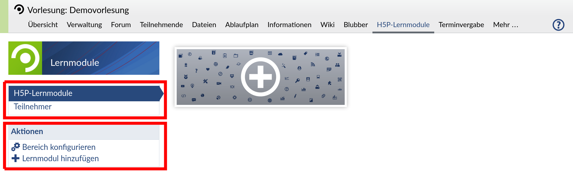 In der linken Spalte befinden sich einige Aktionen, die Sie ausführen können. Sie können die Ansicht verändern und Ihre Lernmodule in Blöcken organisieren. Auch haben Sie die Möglichkeit, dem Reiter einen eigenen Namen zu geben und eine Beschreibung hinzuzufügen.