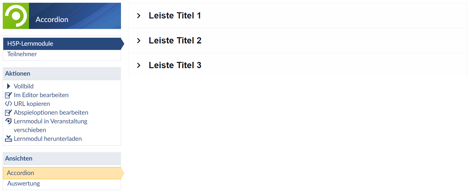 Sie können sich das Lernmodul im Vollbild anzeigen lassen. Wenn Sie das Lernmodul bearbeiten möchten, wählen Sie "Im Editor bearbeiten". Auch können Sie die URL kopieren, um einen Direktlink zum Lernmodul zu erhalten. Sie können die Abspieloptionen bearbeiten, wenn das Modul z.B. von einem anderen Modul abhängig sein soll. Möchten Sie das bestehende Lernmodul in eine andere Veranstaltung verschieben, wählen Sie "Lernmodul in Veranstaltung verschieben". Alternativ können Sie das Lernmodul herunterladen.