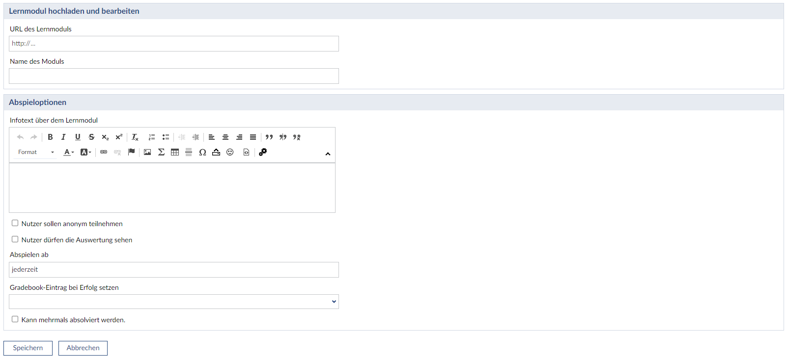 Geben Sie dafür die URL des Lernmoduls ein und vergeben Sie den Namen des Moduls. Auch können Sie einen Infotext über dem Lernmodul anzeigen lassen. Zusätzlich können Sie entscheiden, ob Nutzer anonym teilnehmen können oder ob die Nutzer die Auswertung sehen können. Möchten Sie das Lernmodul erst zu einem späteren Zeitpunkt zur Verfügung stellen, legen Sie unter "Abspielen ab" ein Datum fest. Unter "Gradebook-Eintrag bei Erfolg setzen" können Sie ein bestehendes Gradebook auswählen um dort bei Absolvieren des Lernmoduls einen Eintrag zu setzen. Entscheiden Sie zum Schluss, ob das Modul mehrmals absolviert werden kann.