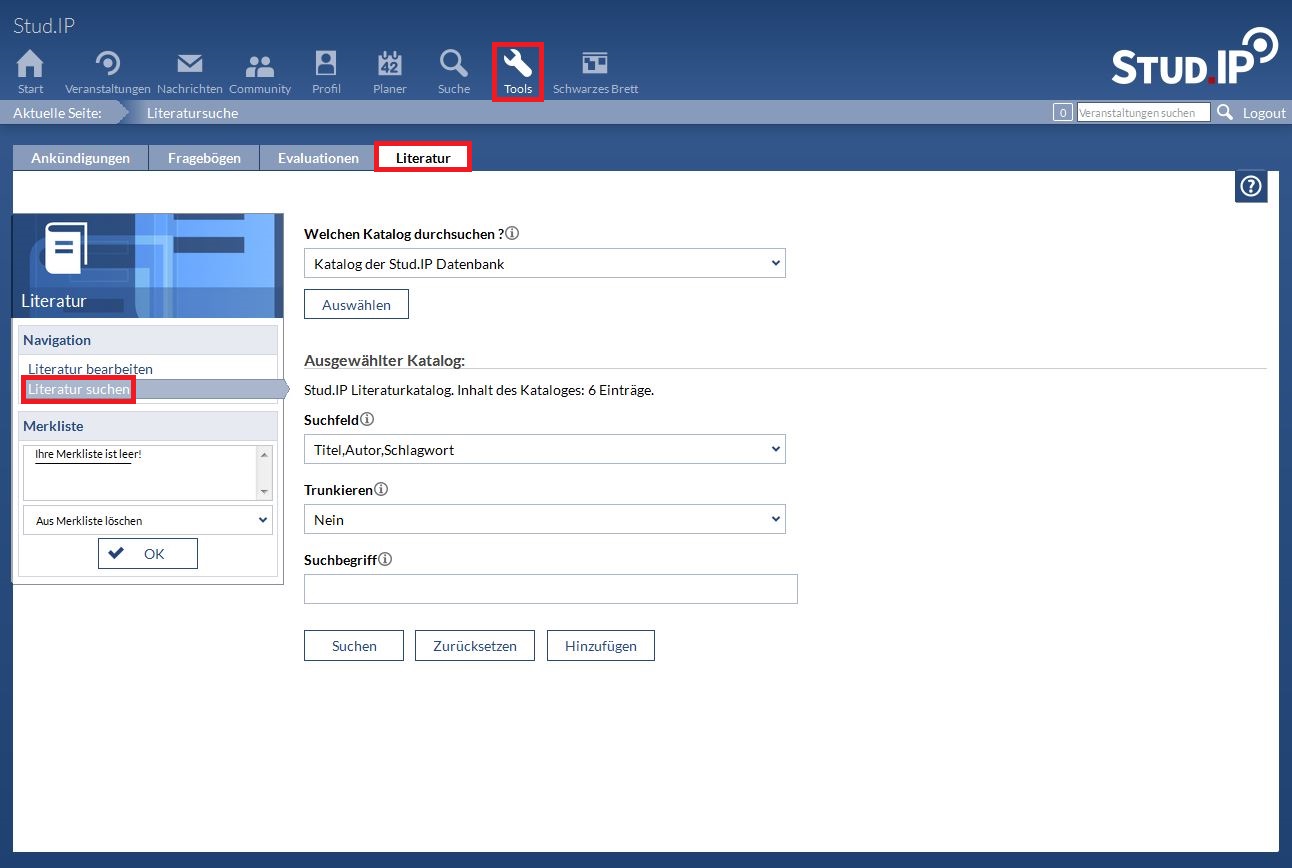 Sie gelangen zur Literatursuche über "Tools" -> "Literatur" und finden links in der Sidebar den Punkt "Literatur suchen".