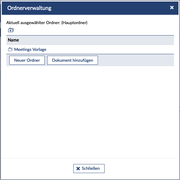 Dies ist eine neue Funktion die ab der Version 2.80 in Meetings verfügbar ist. Inhalte aus dem Dateibereich der Veranstaltung können hiermit in einer kompakten Ansicht verwaltet werden. Die Ordnerverwaltung finden Sie in der Seitenleiste im Bereich "Ordner". HINWEIS: Es können nur Ordner und keine einzelnen Dateien ausgewählt werden.