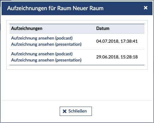 Es werden alle vorhandenen Aufzeichnungen aufgelistet. Aufzeichnungen können direkt von hieraus abgespielt werden. Lehrende haben die Möglichkeit Aufzeichnungen zu löschen.