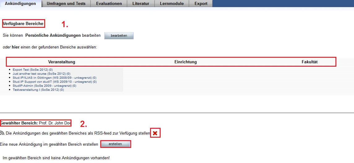 Stud.IP bietet Ihnen auch die Möglichkeit, selbst RSS-Feeds anzubieten. So können andere Stud.IP-Nutzer, oder falls Sie DozentIn sind, auch TeilnehmerInnen Ihrer Veranstaltung, Neuigkeiten als Feed abonnieren. Um Feeds zu erstellen, klicken Sie auf der Kopfleiste auf den Punkt "Tools". Sie erhalten folgende Ansicht: