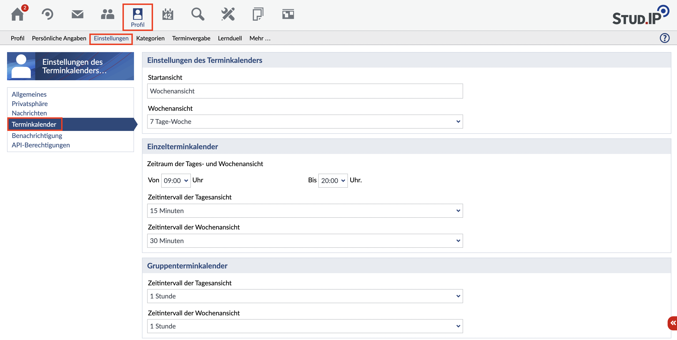 Sie erreichen diesen Bereich, indem Sie auf "Profil", "Einstellungen" und dann auf "Terminkalender" klicken. Hier können Sie das Erscheinungsbild Ihres Terminkalenders anpassen.