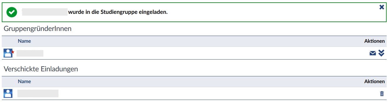 Die eingeladene Person erhält eine E-Mail mit einem Link zu Ihrer Studiengruppe. Mit einem Klick auf diesen Link trägt sich diese in Ihre Studiengruppe ein. Bis dahin erscheint diese Person unter "Teilnehmende" bei "Verschickte Einladungen".