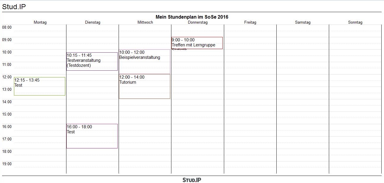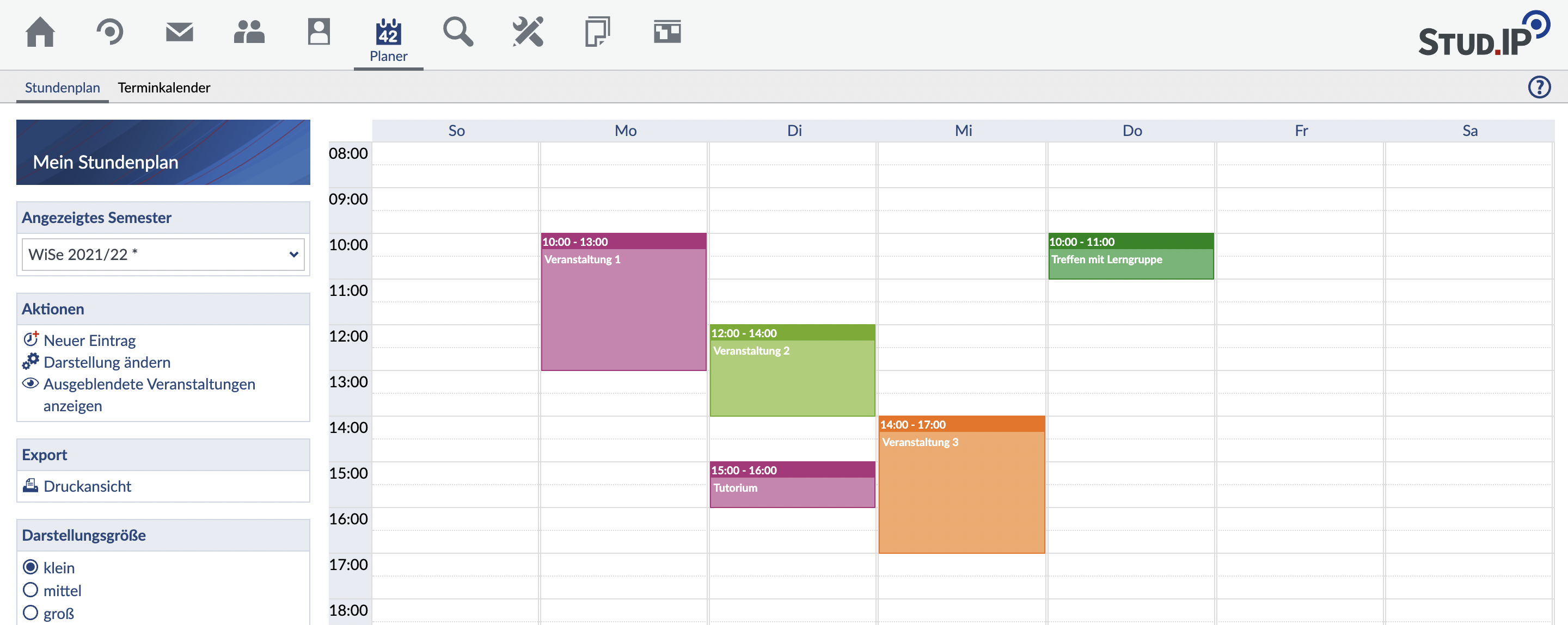 Der Stud.IP-Stundenplan ist eine wirklich praktische Sache: endlich zu Semesterbeginn kein Rumgeschmiere mehr auf irgendwelchen Zettelchen! Der Stundenplan führt automatisch alle Veranstaltungen, in die Sie eingetragen sind, übersichtlich auf.