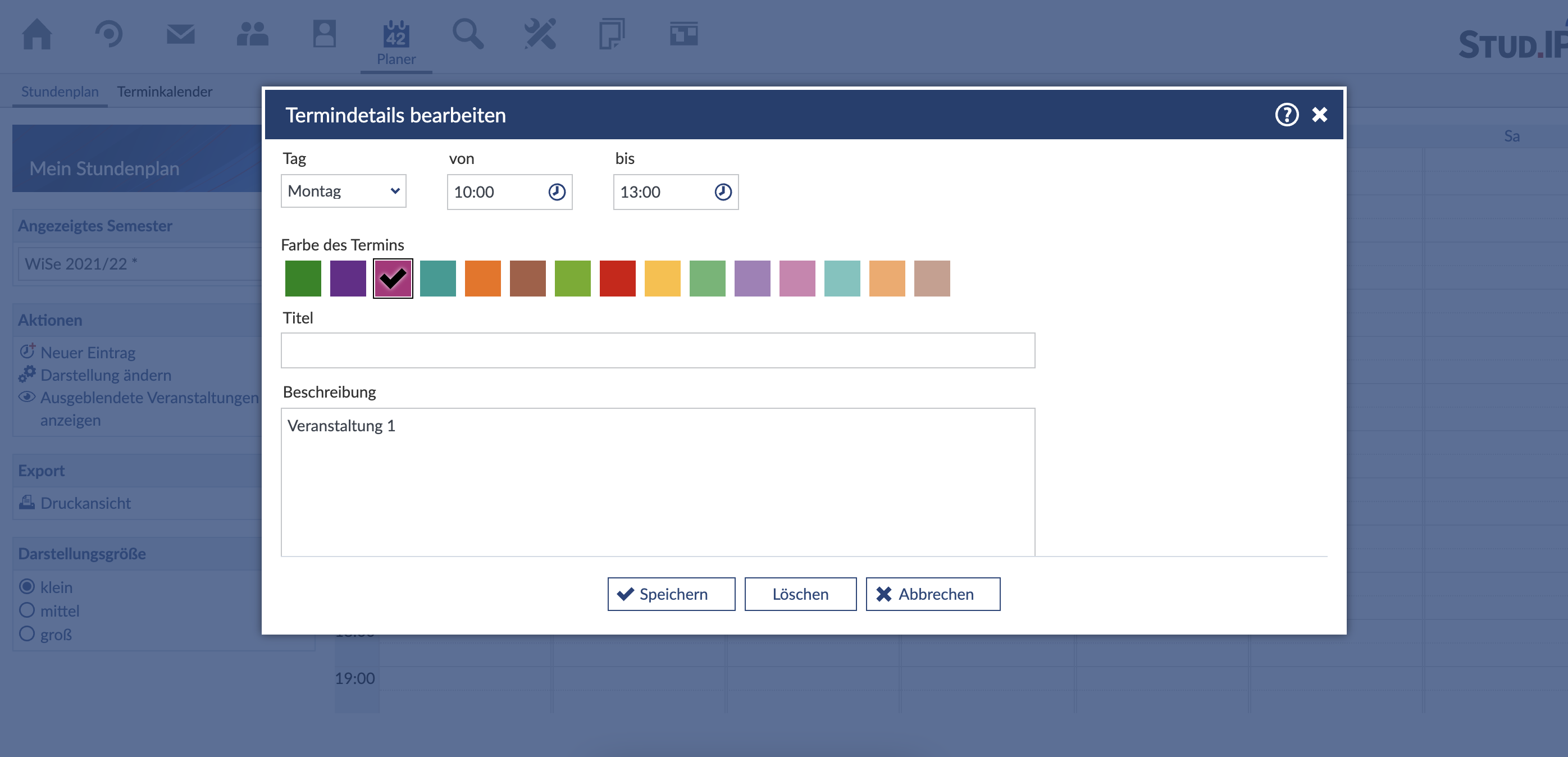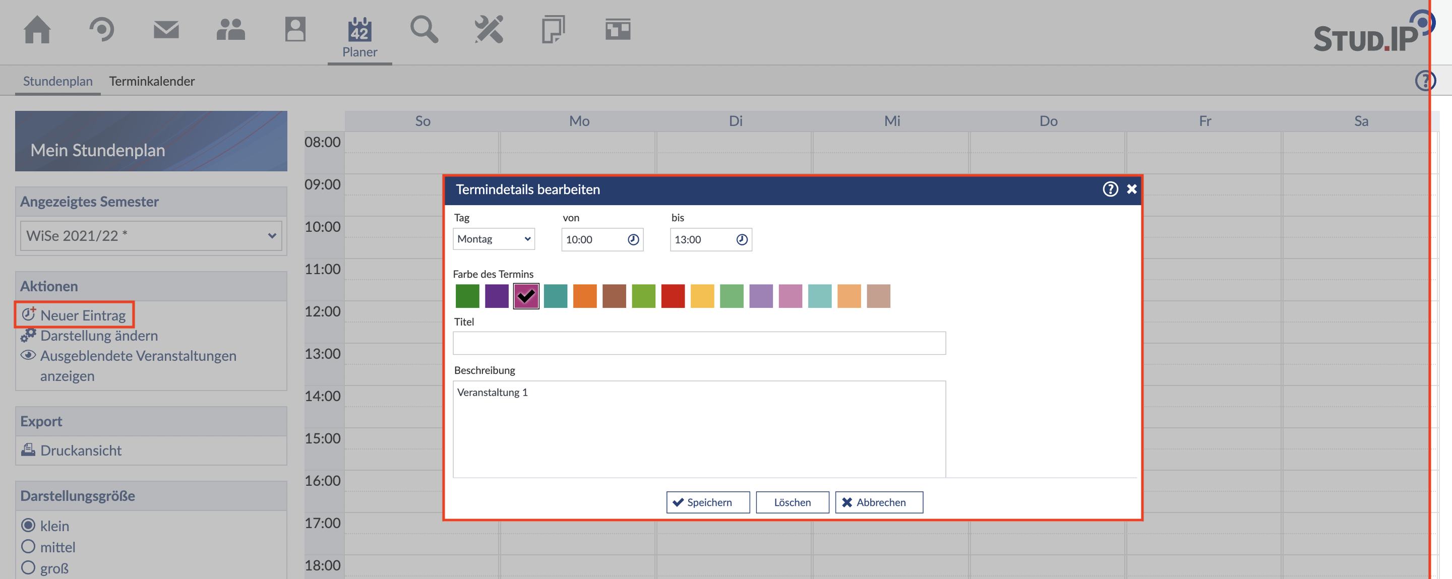 Ein Klick auf "speichern" fügt Ihren Eintrag dem Stundenplan hinzu.