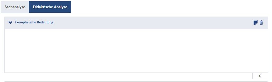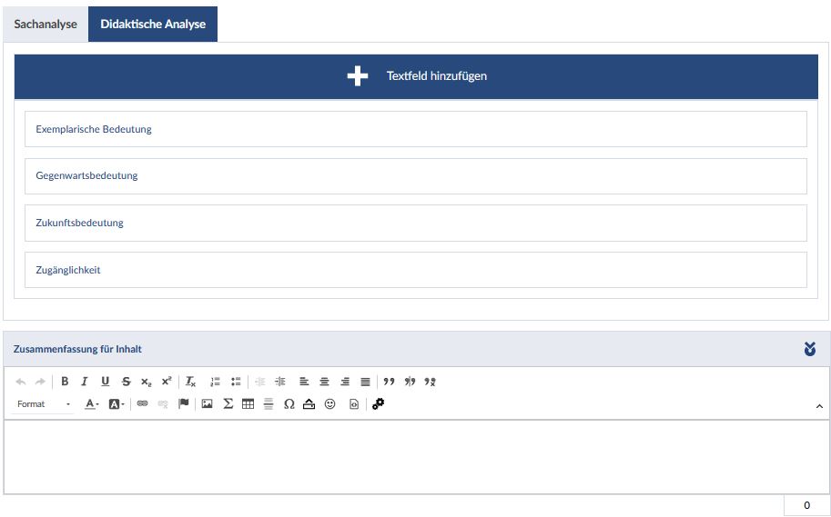Sobald Sie auf die Schaltfläche Didaktische Analyse klicken, können Sie die didaktische Bedeutung des ausgewählten Inhalts formulieren. Zur Auswahl stehen die folgenden Textfelder: Exemplarische Bedeutung, Gegenwartsbedeutung, Zukunftsbedeutung und Zugänglichkeit. Um ein Textfeld für eine Bedeutungsdimension hinzuzufügen, klicken Sie auf die Schaltfläche