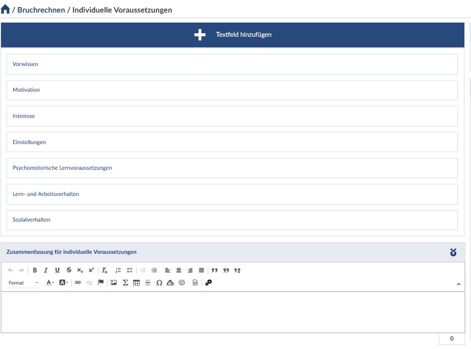 +Textfeld hinzufügen werden die Teilbereiche Vorwissen, Motivation, Interesse, Einstellungen, Psychomotorische Voraussetzungen, Lern- und Arbeitsverhalten und Sozialverhalten aufgelistet und können von Ihnen einzeln angewählt, angelegt und bearbeitet werden. Um die Inhalte aus den einzelnen Textfeldern schließlich zusammenzuführen, klicken Sie im Feld Zusammenfassung für individuelle Voraussetzungen auf das Icon