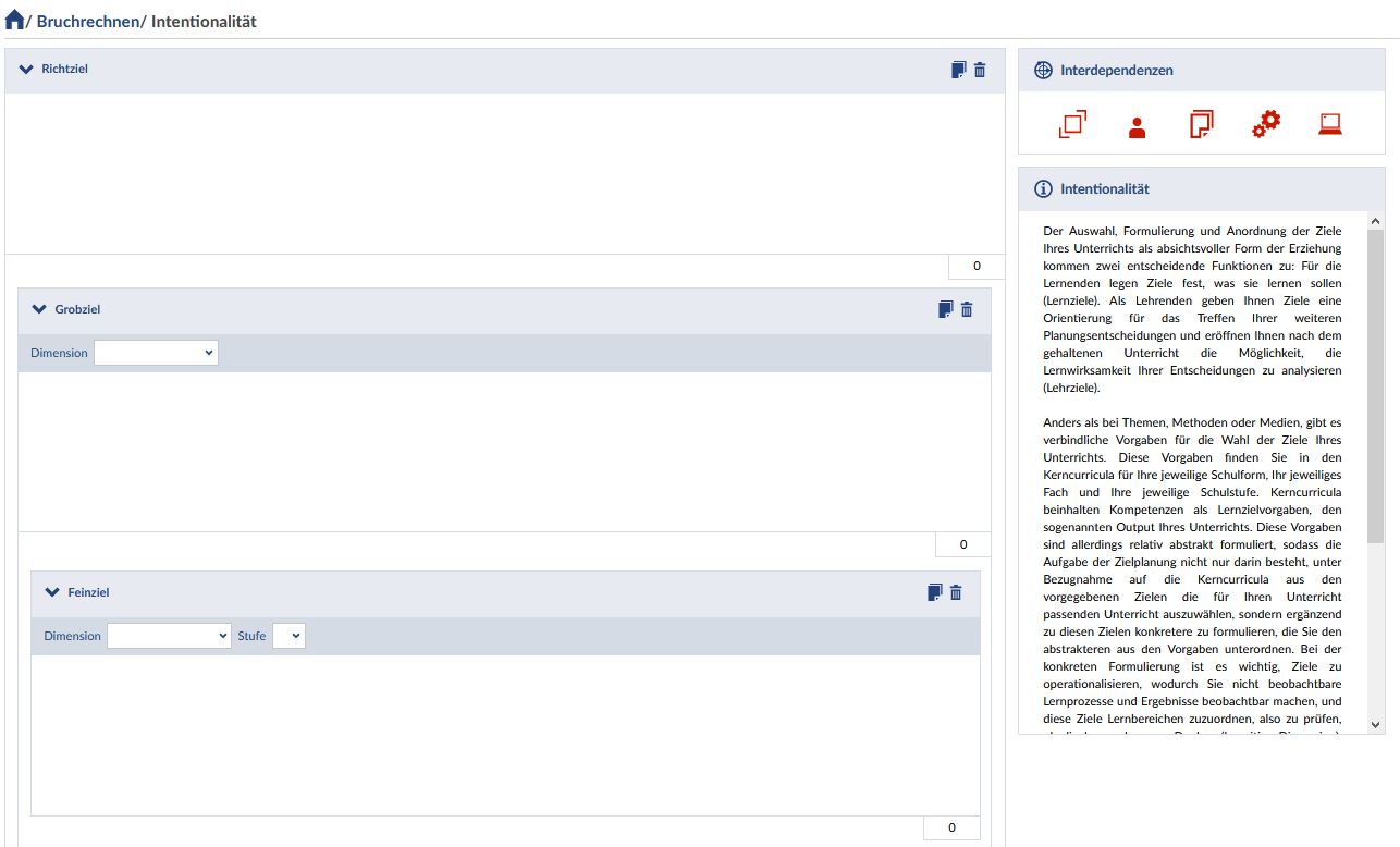 Im Planungsbereich Intentionalität können Sie Lernzielhierarchien anlegen und Richt-, Grob- und Feinziele formulieren. Bei den Grobzielen können Sie eine Dimension (kognitiv, affektiv, psychomotorisch) hinzufügen. Diese Option steht Ihnen auch bei den Feinzielen zur Verfügung, für die außerdem Stufen festlegt werden können.