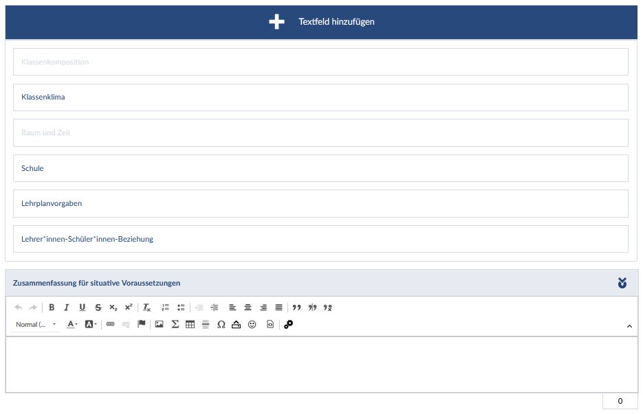 Beispiel: Für Ihre Verschriftlichungen der Teilbereiche innerhalb der Situativen Voraussetzungen steht Ihnen jeweils ein Textfeld zur Verfügung. Im folgenden Beispiel sind die Textfelder für die Klassenkomposition und Raum und Zeit bereits ausgewählt worden und können dementsprechend nicht ein zweites Mal als weitere Textfelder hinzugefügt werden.