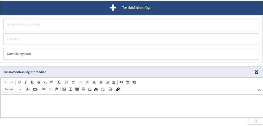 Achten Sie darauf, dass Änderungen, die Sie in der Zusammenfassung für Medien vornehmen, nicht in die einzelnen Textfelder übertragen werden, und dass ein erneutes Befüllen der Zusammenfassung für Medien durch die Inhalte der Textfelder diese Änderungen überschreibt.