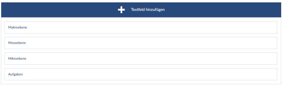 +Textfeld hinzufügen und wählen Sie anschließend eine Ebene für die Analyse der Methodik aus, um das Textfeld für die gewünschte Ebene zu öffnen. Zur Auswahl stehen die Makroebene, die Mesoebene, die Mikroebene und Aufgaben.