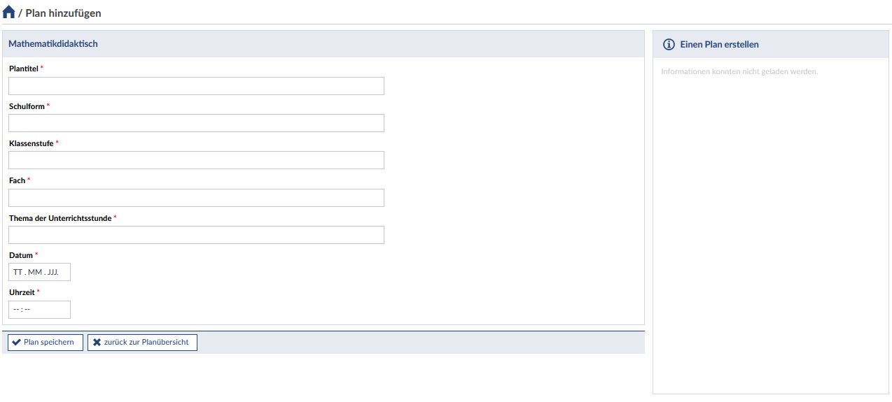 Nachdem Sie Ihre Auswahl getroffen haben, öffnet sich die Seite Plandetails, auf der Sie die für Ihren Unterrichtsplan grundlegenden Angaben zum Plantitel, zur Schulform, zum Fach, zum Thema der Unterrichtsstunde, zu deren Datum und zu deren Uhrzeit anonymisiert eingeben. Bitte beachten Sie, dass in allen Eingabefeldern Eintragungen vorgenommen werden müssen, bevor die Übersichtsseite des Planungstools aufgerufen wird und Sie mit der Strukturplanung beginnen können. Ihre Eintragungen können zu einem späteren Zeitpunkt geändert werden. Durch einen Klick auf die Schaltfläche