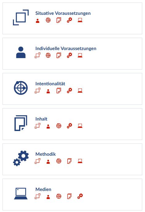 Zurück in der Übersicht über alle Planungsbereiche erscheint das angeklickte Icon der Medien im Planungsbereich Methodik nun gelb, da die beiden Planungsbereiche noch nicht wechselseitig berücksichtigt, sondern bisher nur aus der Perspektive der Methodik betrachtet wurden.