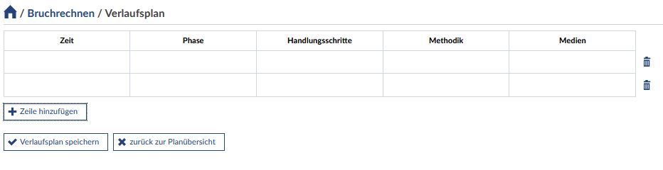 Eintragungen in den Spalten Zeit, Phase, Handlungsschritte, Methodik und Medien sind durch Klicken der Schaltfläche +Zeile hinzufügen möglich. Eine eingefügte Tabellenzeile können Sie mit dem Icon