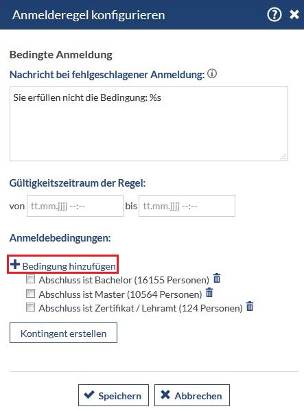 Es ist darüber hinaus möglich, Bedingungen wie Studiengang und angestrebter Abschluss an die Anmeldung zu knüpfen.