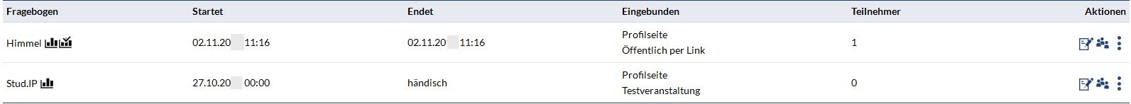 Je nach dem für welche Möglichkeit Sie sich entschieden haben, erscheint in der Verwaltungsansicht in der Spalte "Endet" , das gewählte Datum oder der Hinweis den Fragebogen händisch zu beenden.