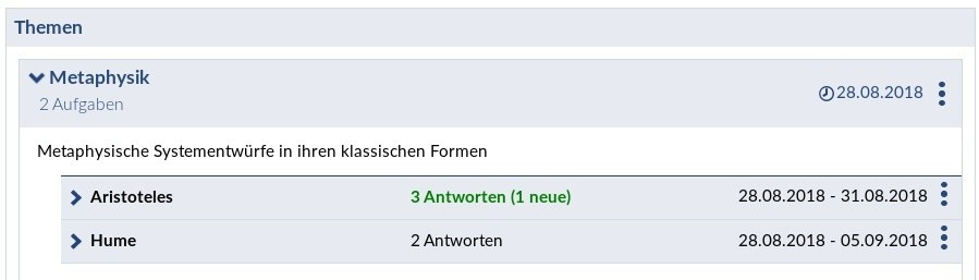 Ein Klick auf ein Thema zeigt Ihnen die dazugehörigen Aufgaben mit weiteren Informationen (z.B. Zahl der bisher abgegebenen Antworten). Die Sortierung erfolgt nach dem Sichtbarkeitsdatum (zeitlich absteigend).