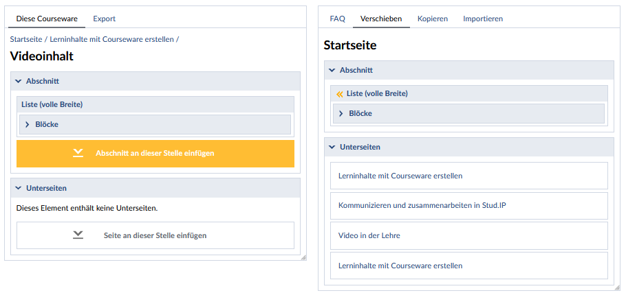 In der Ansicht zum Verschieben von Inhalten wird Ihnen zunächst Ihre aktuelle Courseware-Struktur in zwei Bereichen nebeneinander angezeigt, da Sie beim Verschieben von rechts nach links verschieben werden. Die Ansicht zum Kopieren ist analog aufgebaut, jedoch wählen Sie dort zunächst die Veranstaltung aus, aus welcher Sie Inhalte kopieren möchten.