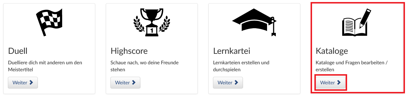 Ein Katalog ist eine Sammlung von Fragen, die im Rahmen des Lernduells unterschiedlich eingesetzt werden können. Um einen Lernkatalog und Fragen dazu zu erstellen, klicken Sie auf den Button [Weiter] im Feld „Kataloge“.