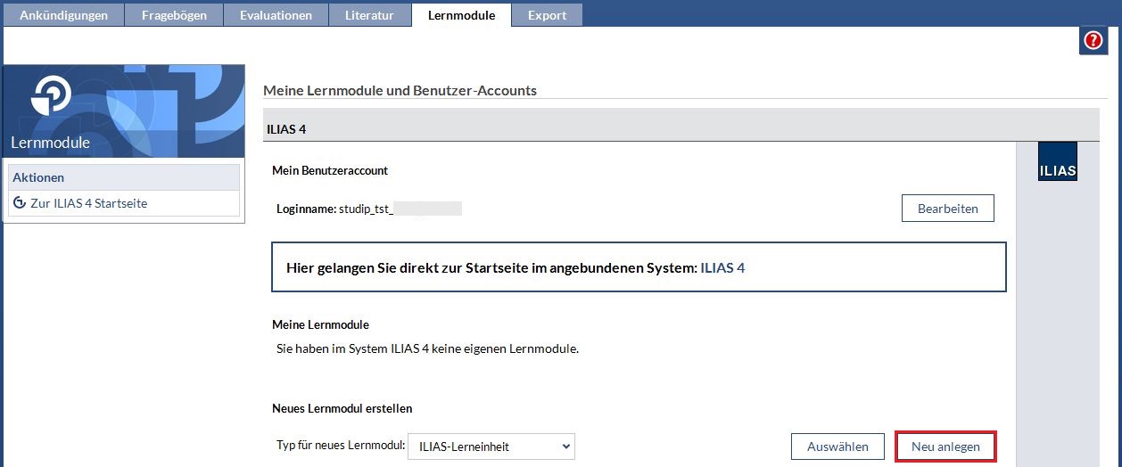 - Im ersten Schritt wird das Lernmodul in Stud.IP bestimmt und neu angelegt.