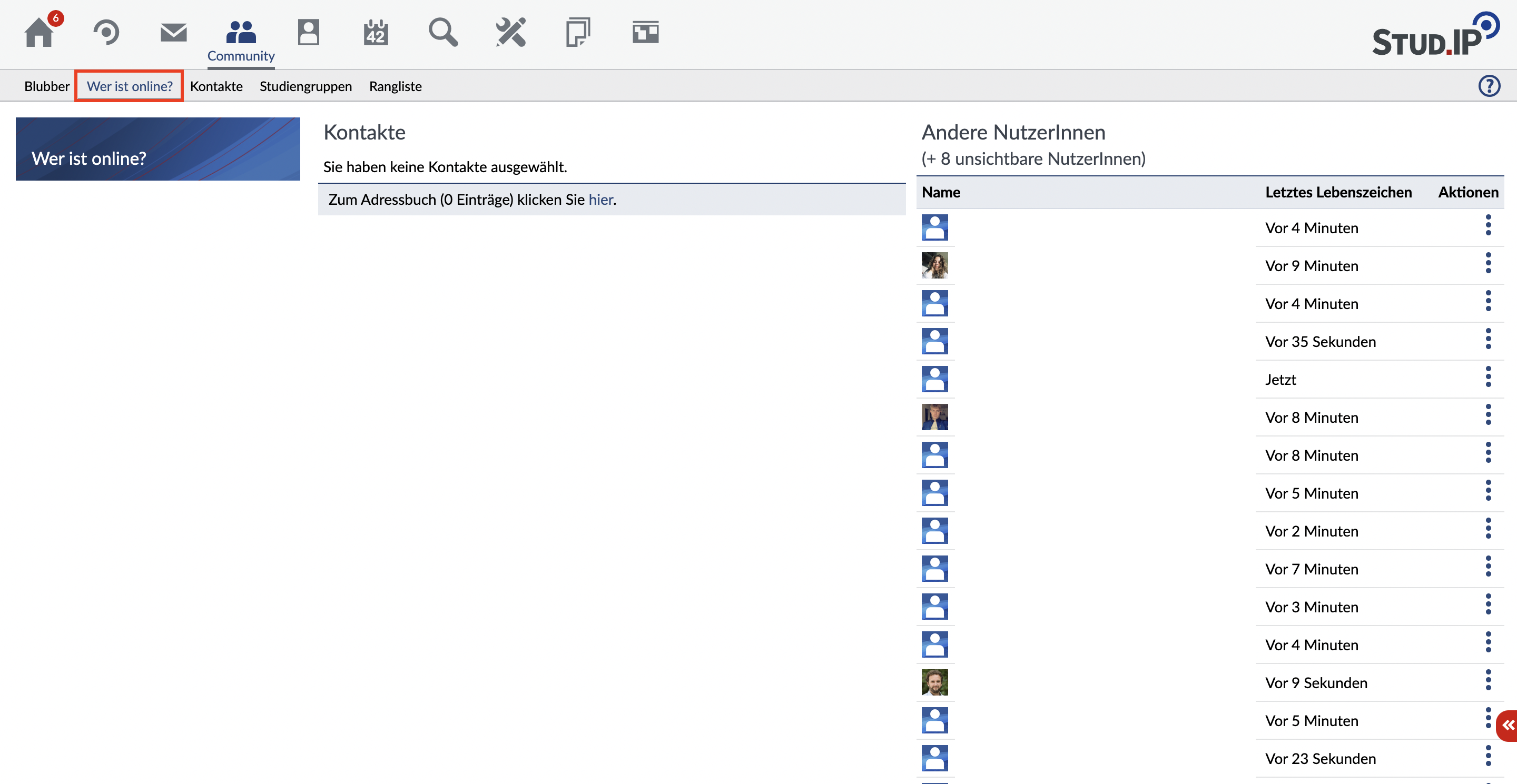 Klicken Sie auf einen der Namen, gelangen Sie auf das Profil der entsprechenden Person. Die nächste Spalte (Letztes Lebenszeichen) gibt an, seit wann der- oder diejenige keine Aktion mehr im System unternommen hat (auf etwas geklickt, die Seite gewechselt etc.).