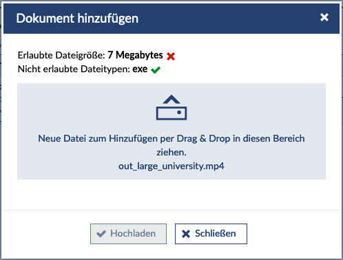 Wenn eine Datei die Anforderungen nicht erfüllt, erscheinen rote Symbole, die auf die Ungültigkeit hinweisen, und die Schaltfläche zum Hochladen bleibt deaktiviert.