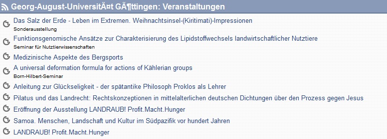 Beispielsweise möchten Sie die Veranstaltungsnews der Uni Göttingen Internetseite innerhalb von Stud.IP anzeigen lassen. Gehen Sie dazu auf die Seite mit dem RSS-Feed, den Sie abbonieren möchten und klicken Sie mit der rechten Maustaste auf das RSS-Feed Symbol und kopieren Sie die URL des Feeds: