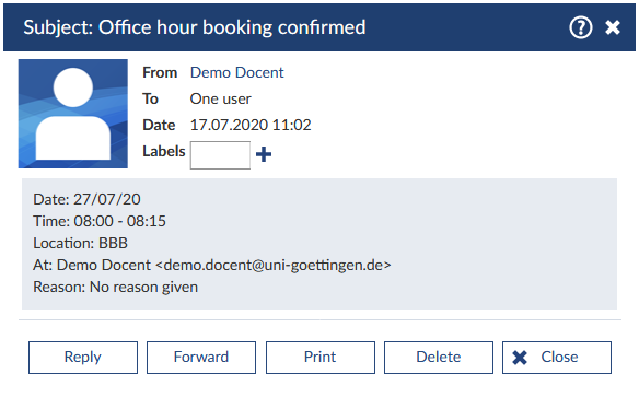 When a person reserved an office hour, you will also receive a message containing all of the important information as date, time and room of the reservation. The person, who has booked the date, is the sender of the message.