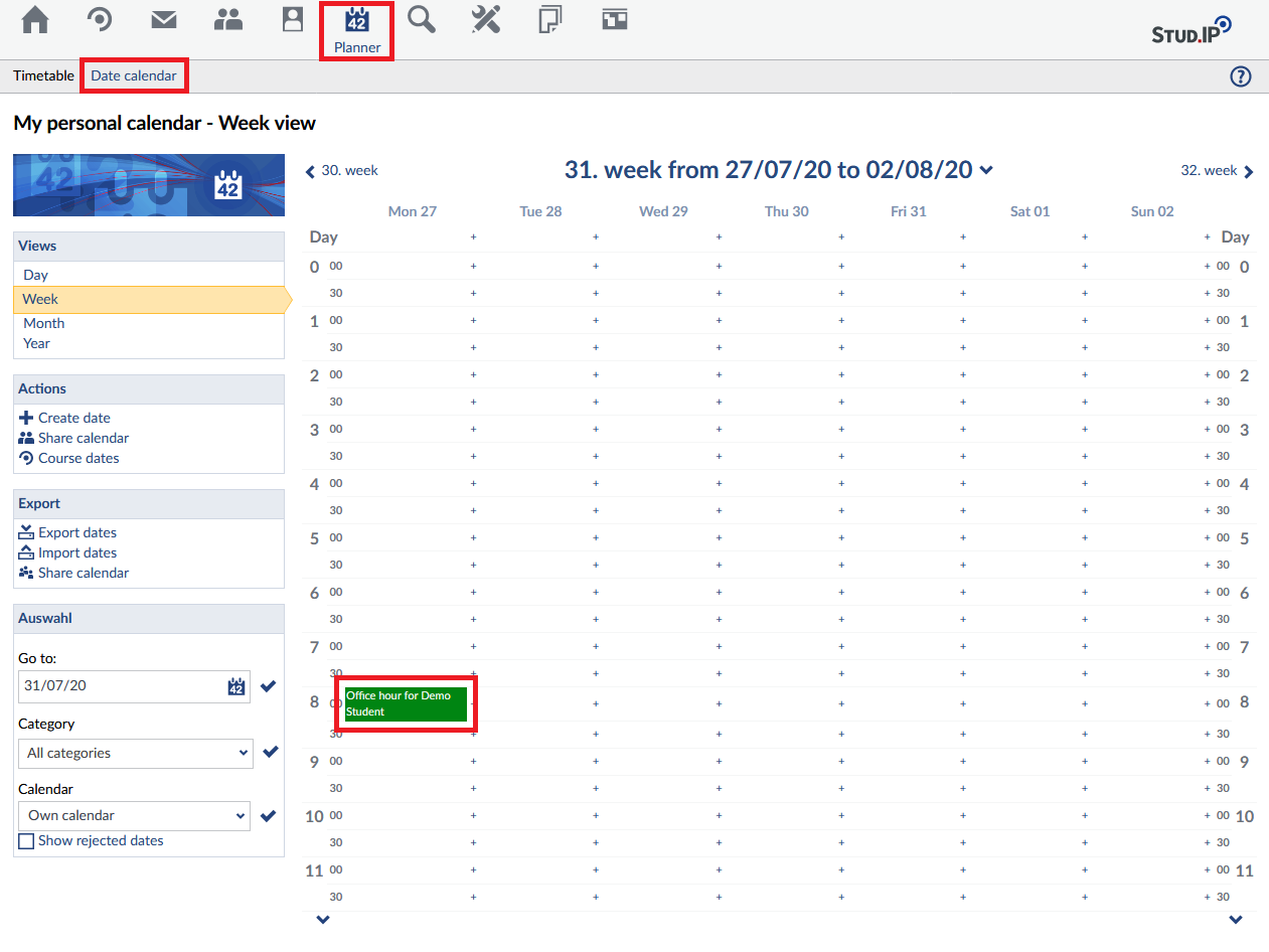 The booked office hour will be also enterd in your personal date calender.