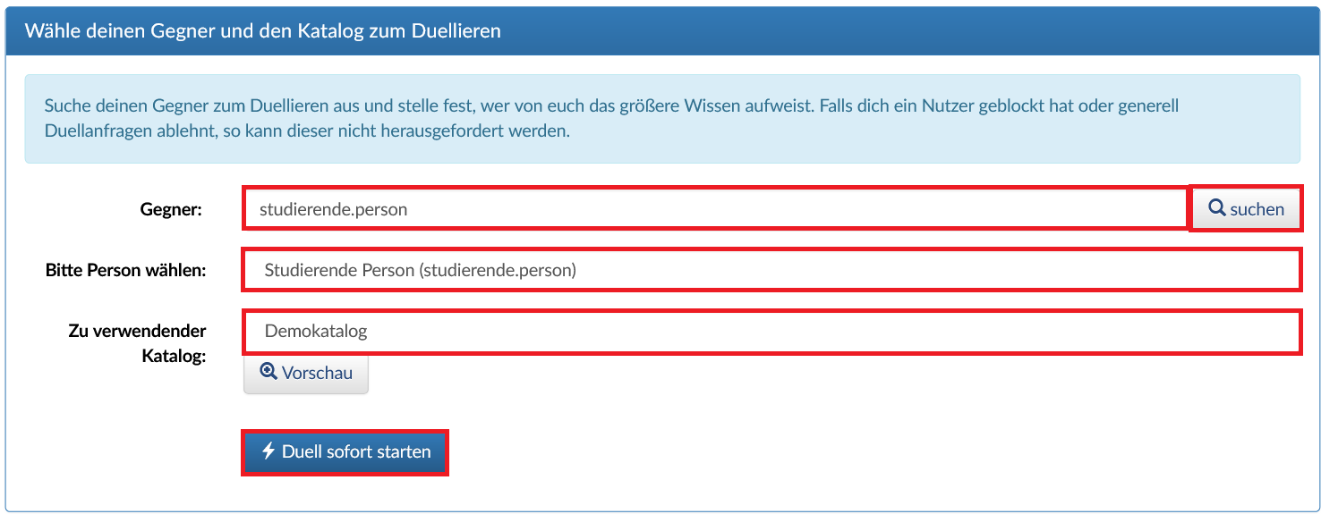 If you want to challenge a person of your choice, please click [Neues Duell starten] ("start new duel"). Enter the name oder the user ID of the person in the field "Gegner" ("enemy") and click [suchen] ("search"). Choose the right person and the questionnaire you would like to use. After you set everything the way you want to, click [Duell sofort starten] ("start duel right now").