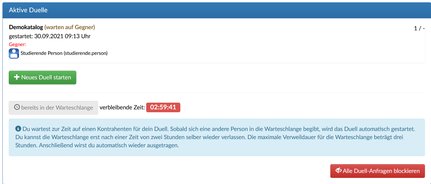 When you enter the queue, you will be connected to a random person which has entered the queue, too. You will stay no more than three hours in the queue. To get the chance to be connected with an unknow person, please click [Die Warteschlange betreten] ("enter queue"). After that, you can see in the overview how much time remains in the queue. If you are already participating in an active duel, you can see details about that in the overview, too.