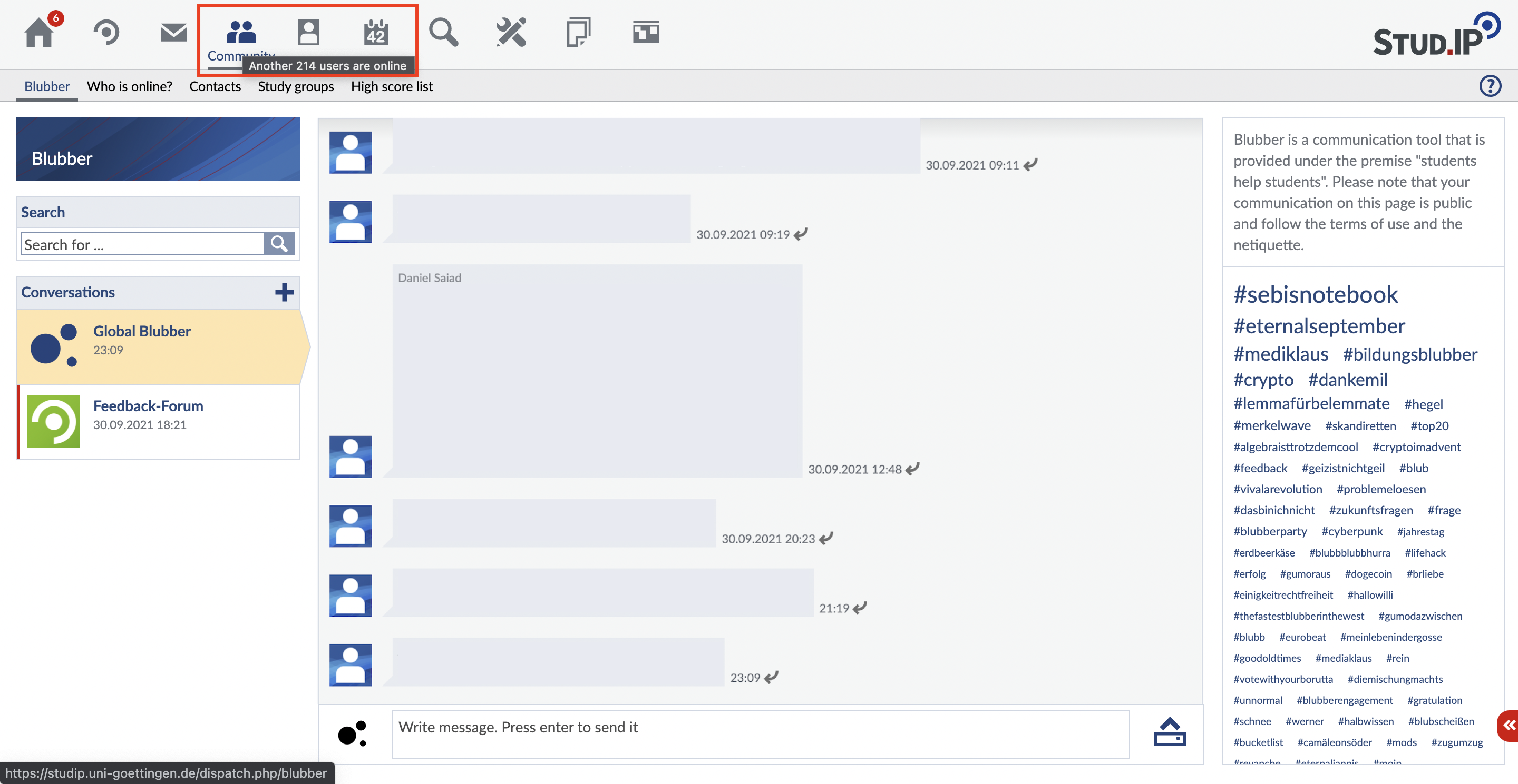 If a given person is inactive for a certain period of time, he or she is removed from the list. Similarly, the person is removed when he or she properly logs out of the system via the logout link on the header bar. It can be aggravating if you leave Stud.IP without having properly logged out — after all the other users still see you in the “Who is online” list for at least 5 minutes and perhaps attempt to contact you. It is therefore correct "netiquette" to properly log out of Stud.IP by clicking on the logout link.< Interaction with others | Overview | Messages >