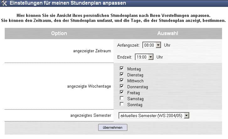 - You can specify from which starting time to which ending time a day in your timetable should be displayed. All time periods between 0:00 and 23:00 hours are possible; the subdivision is in hourly intervals.