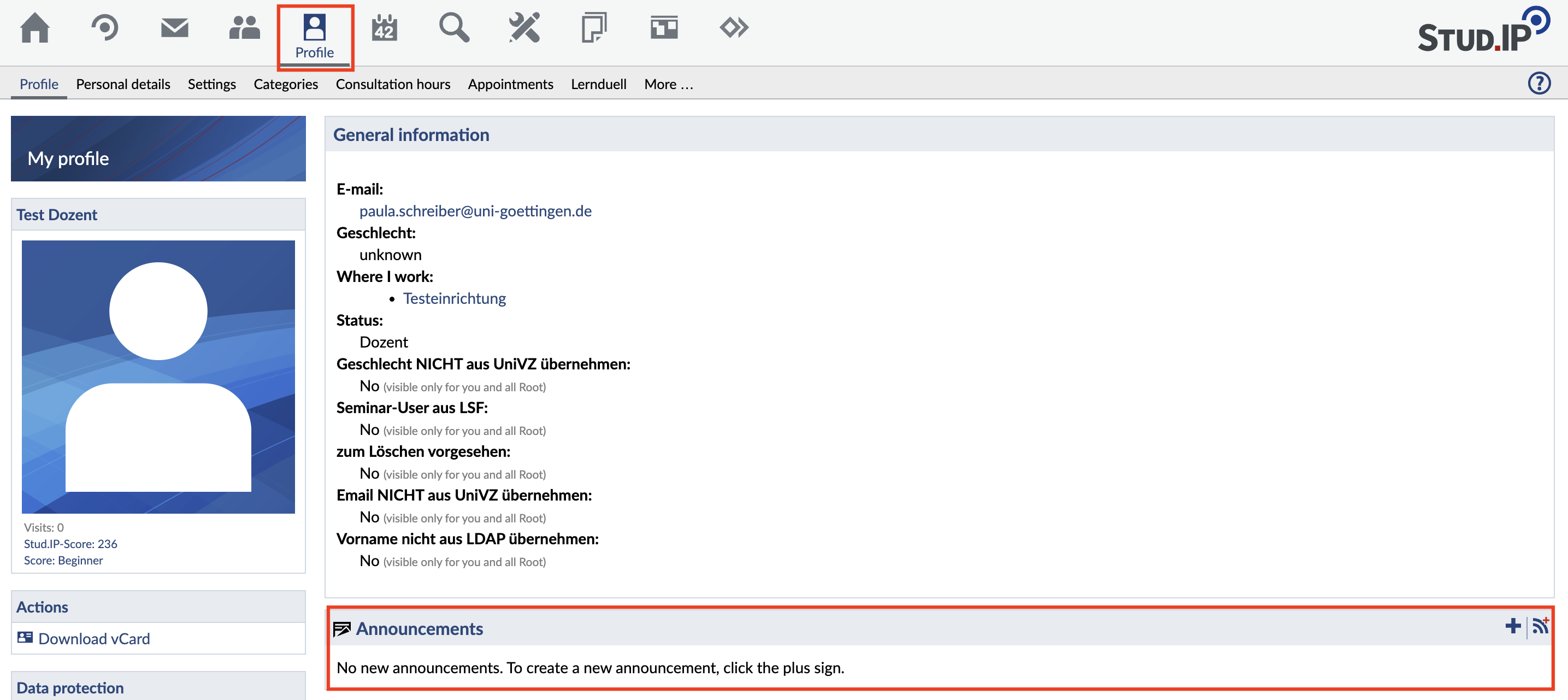 You can now enter a headline and text for your announcement. Use the "Release date" and "Expiration date" buttons to determine from when and until when the announcement should be displayed. You can also choose whether or not to allow comments on your announcement. Check if you want comments to be allowed or leave them unchecked if you don't want comments to be allowed. Now you have to choose where you want the announcement to appear. To do this, click on "Show in other areas". Your own profile ("My profile page") is always available to you for this purpose. If you are a tutor at an event or even a lecturer at an institution, you can also display announcements there. Make your selection so that it is transferred to the selection area on the right. Then click on "Create Announcement" to create your announcement.