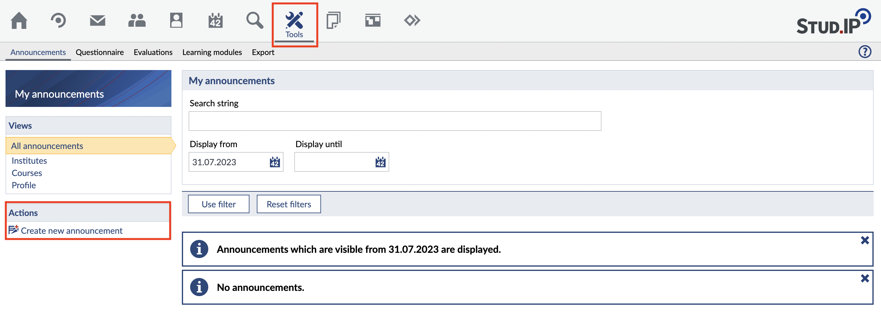 Alternatively, you can also select the Announcements tab in the Tools area and create a new announcement using the Create Announcement button in the sidebar on the left: