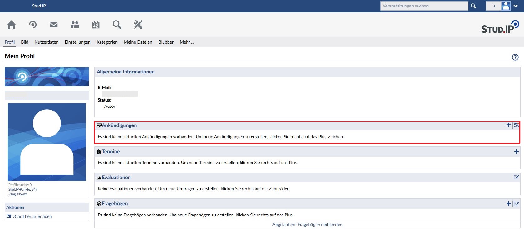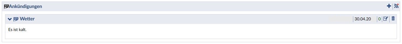 Are there no announcements within a course or an area yet you can see this as well. In this case or if you want to create a new announcement please click on the plus or on the button "create announcement" and do as explained above.