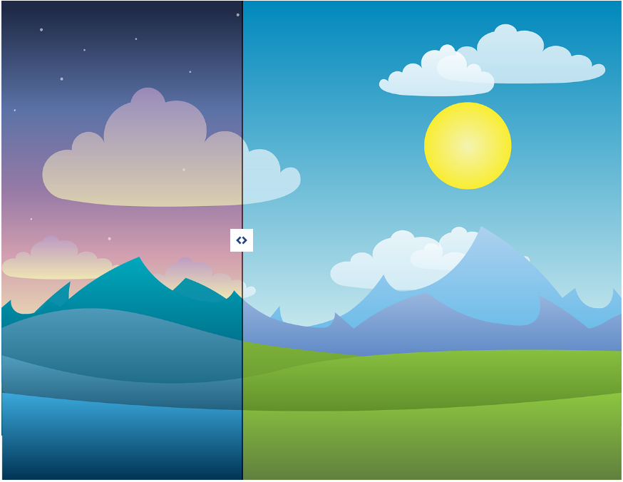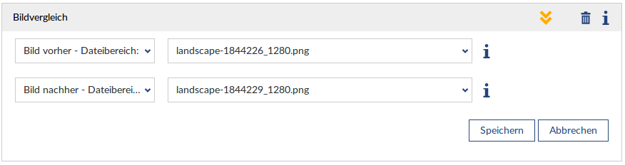 Der Bildvergleich-Block ermöglicht den direkten Vergleich zwischen zwei Bildern. Mit einem Schieberegler kann ein Bild über ein anderes gelegt werden. Die Bilder können von einer URL oder aus dem Dateibereich geladen werden.